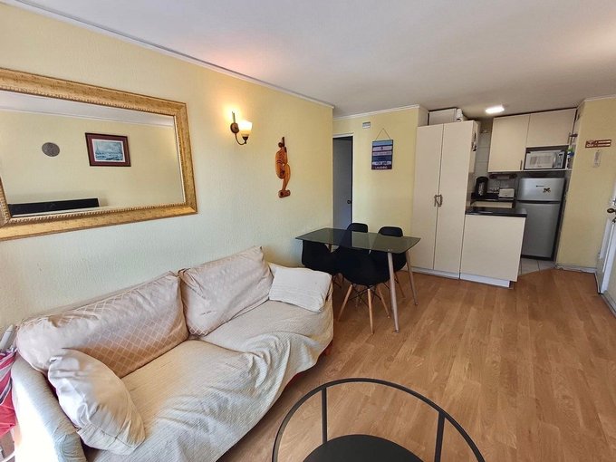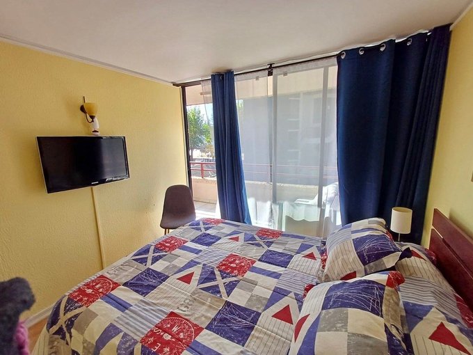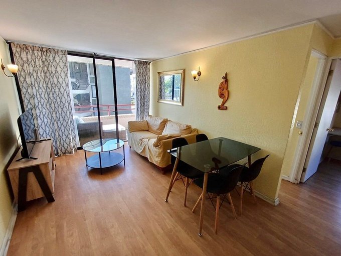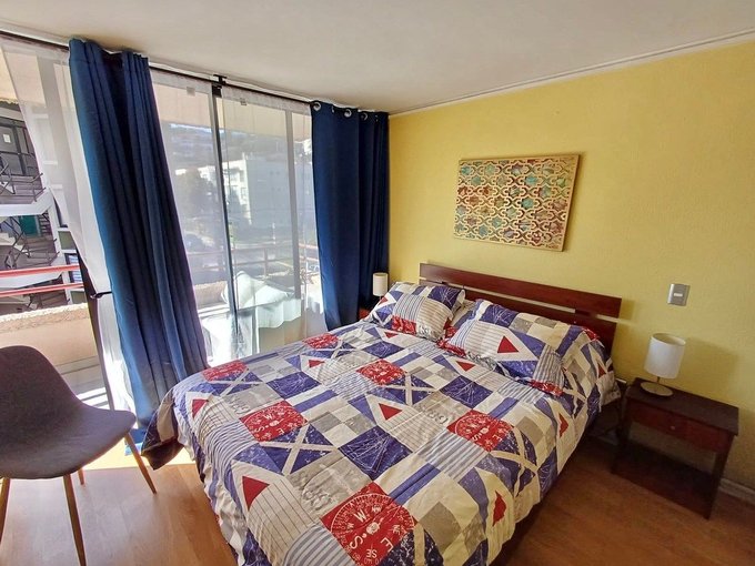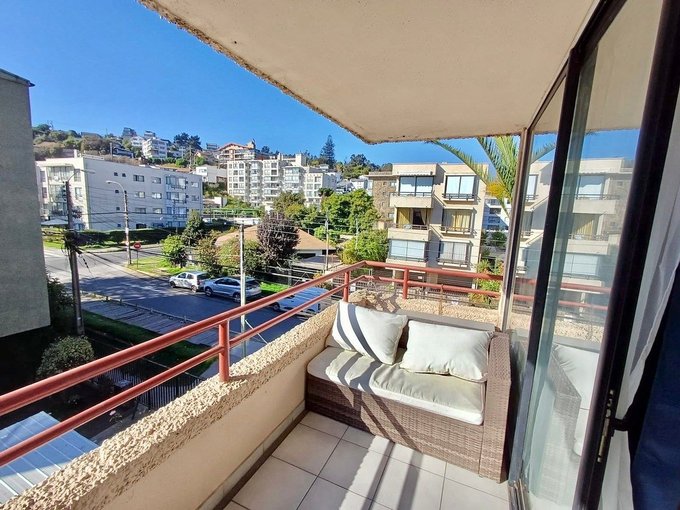 Departamento en tercero piso sin ascensor de dos dormitorios y un baño con tina, cocina americana full equipada y amoblado, salida a la terraza desde el living y dormitorio principal. Orientación Nor oriente en el mejor sector de reñaca a tres cuadras de la playa. Agua caliente com termo