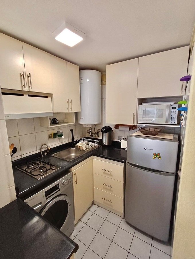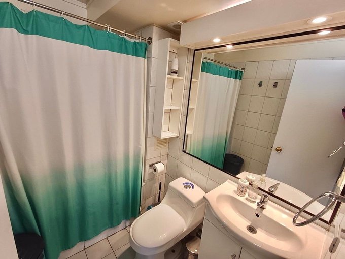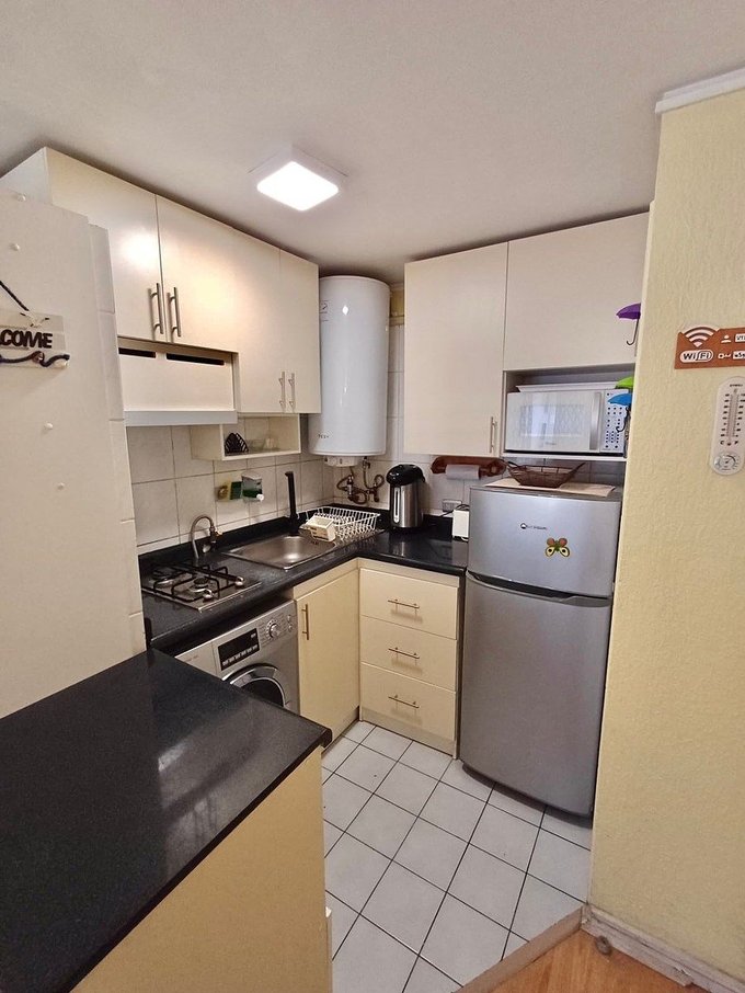 Piso flotante en todo el departamento ceramica en baño y cocina. Cocina amoblada y equipada con encimera a gas de dos platos, campana extractora, refrigerador, microondas, vajilla y utensilios. Agua caliente con termo
