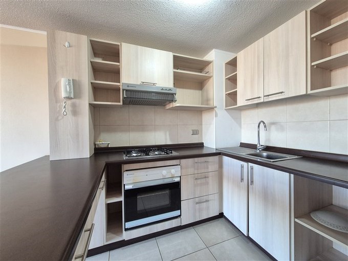 Cocina americana amoblada y equipada con encimera, horno empotrado, campana, despensa