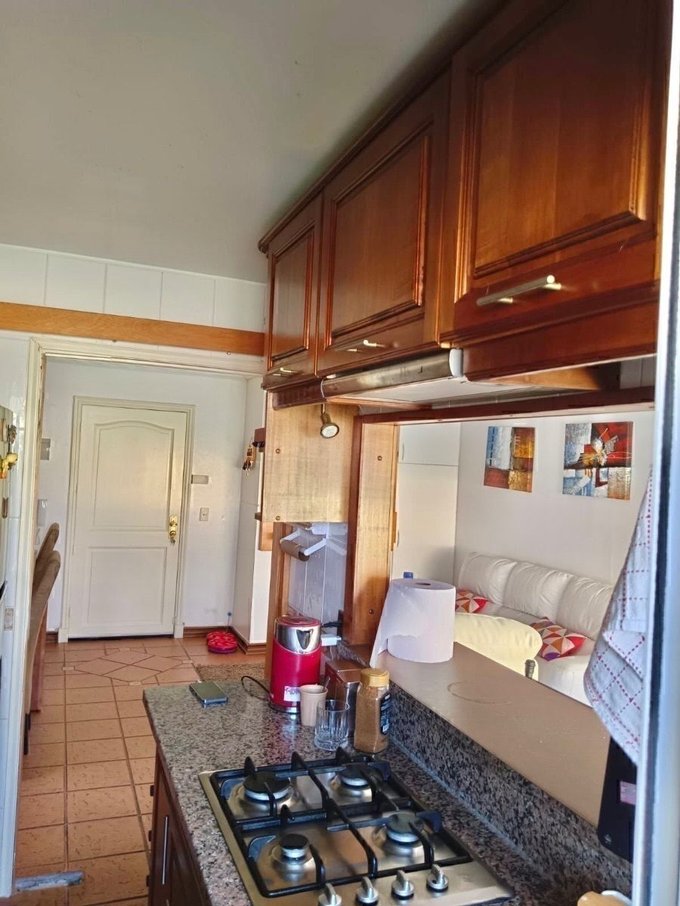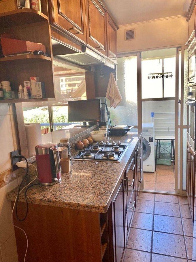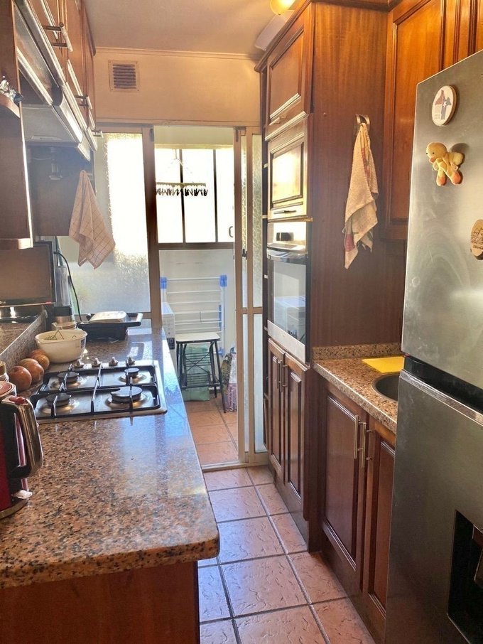 Piso cerámico en living comedor, pasillos, cocina y baños, dormitorios con piso flotante. Ventanas con marcos de aluminio, cubiertas de la cocina en granito y baños de mármol . Cocina equipada con encimera de cuatro platos a gas, horno eléctrico empotrado y campana extractora, agua caliente con calefon en la logia.