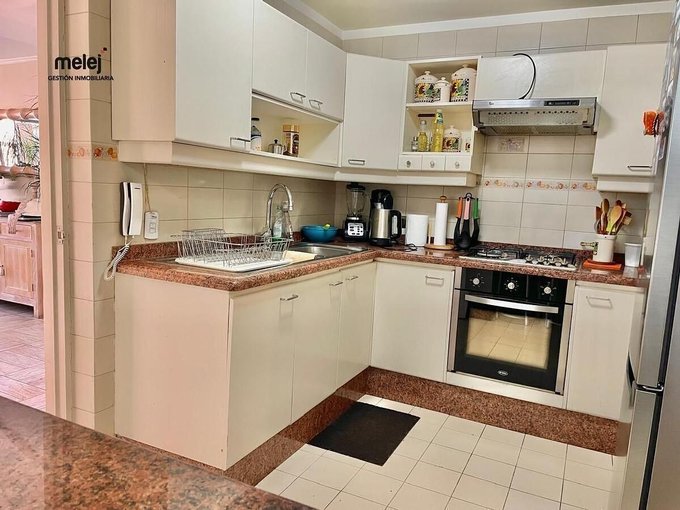 - Cocina independiente completamente equipada con encimera a gas 4 platos y horno. Campana, espacio para refrigerador y mesones de melamina, comedor de diario integrado.