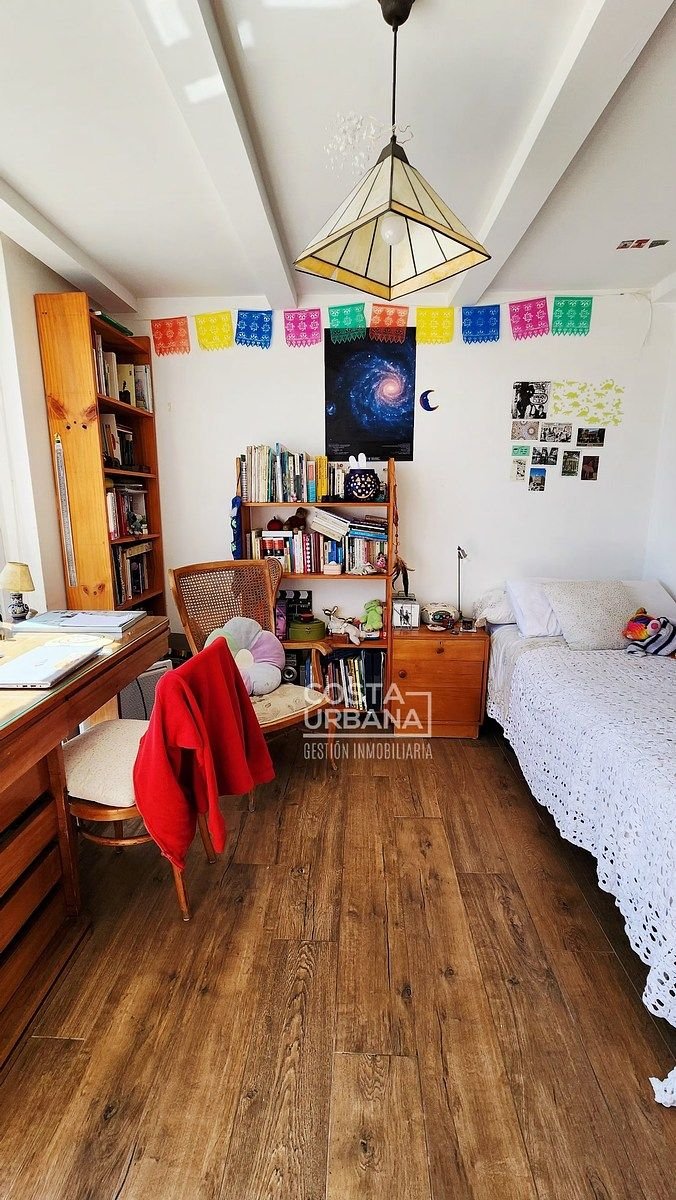 Dormitorio seis, habilitado como home office con una biblioteca de madera.