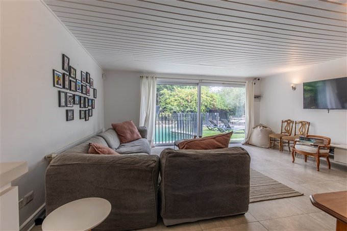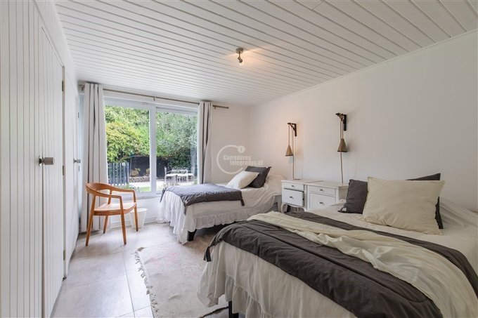 En el área privada, dos dormitorios con salida a patio duro comparten un baño completo. La suite principal destaca por su amplitud, con sala previa o escritorio, walking closet, baño en suite y salida directa al jardín.