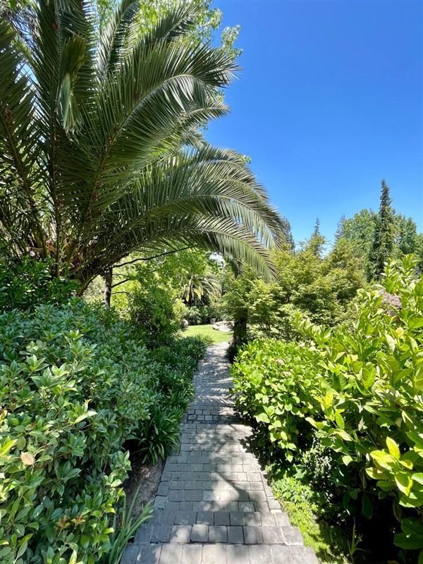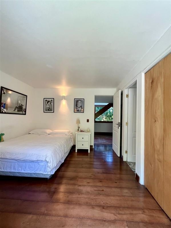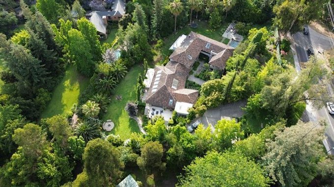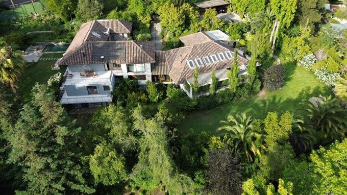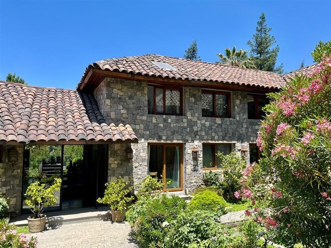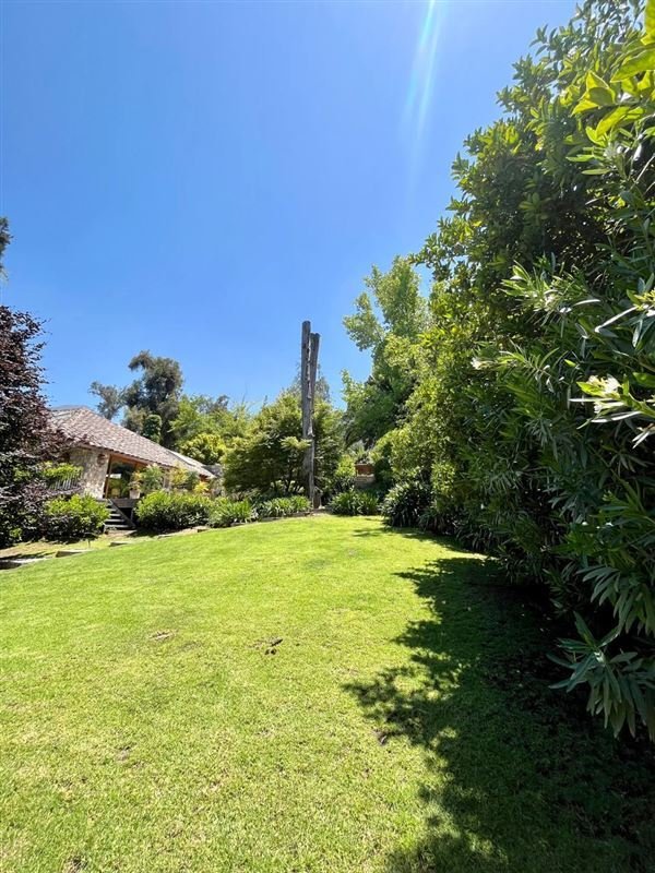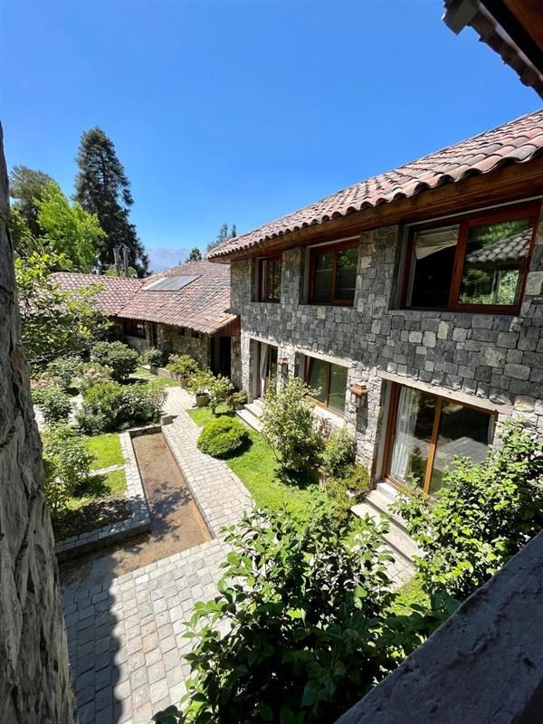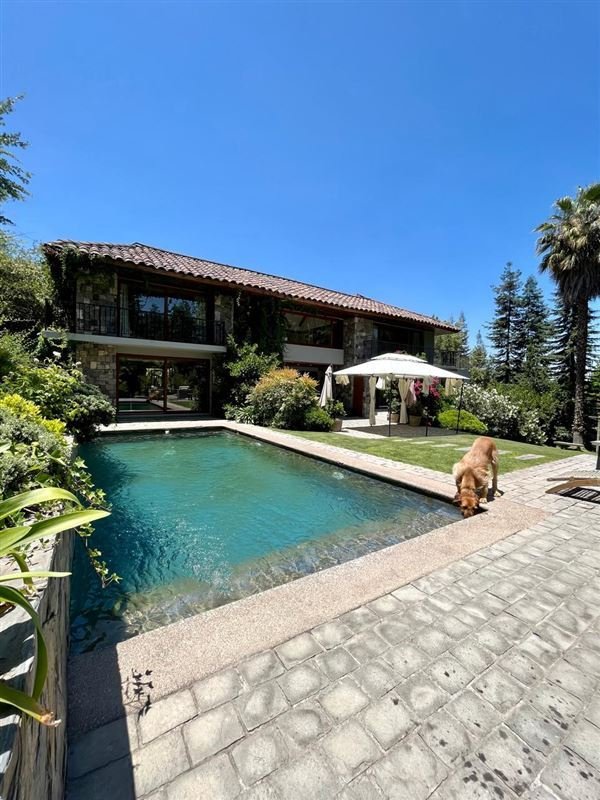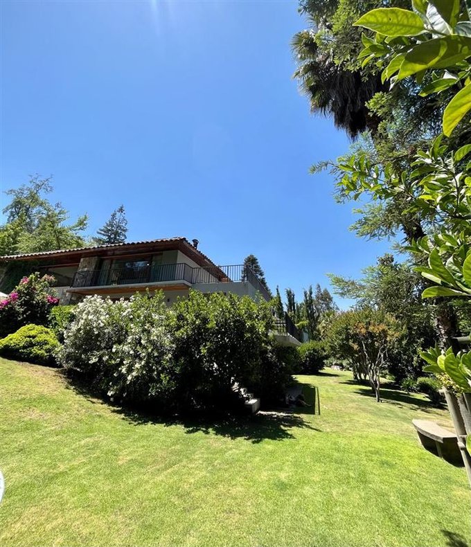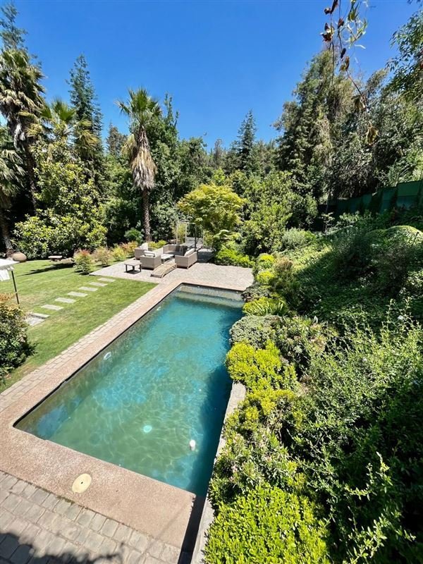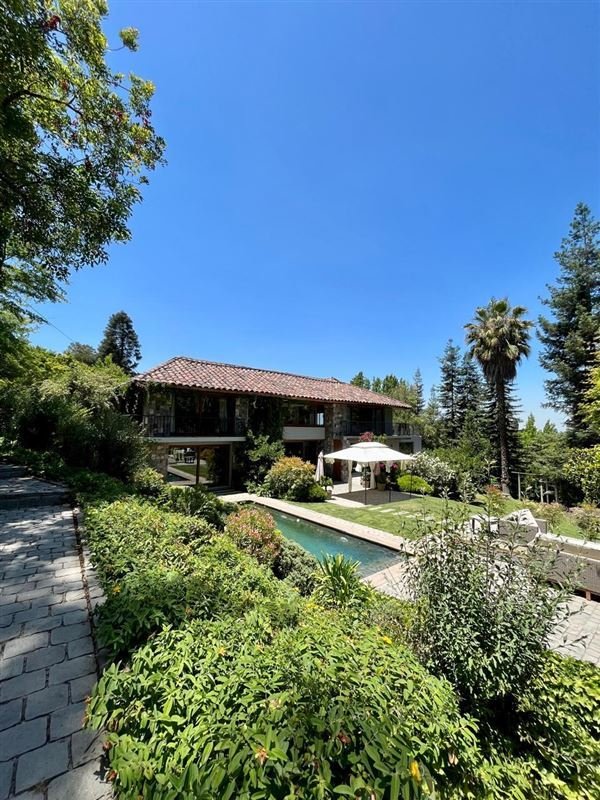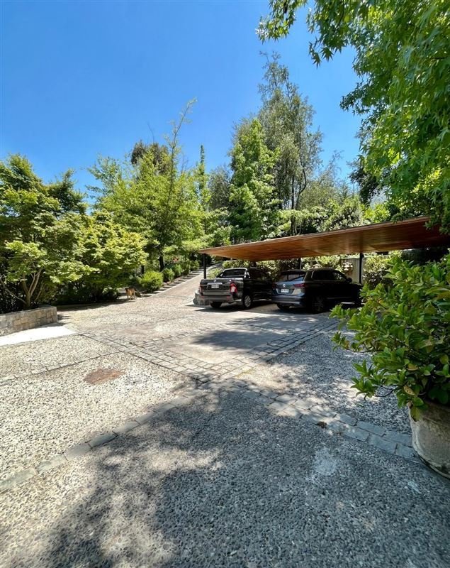 Esta casa rodeada de arboles, ubicada en privilegiado sector de Santiago, un lugar tranquilo y silencioso, tiene una imponente escalera de entrada con bajada de agua que entrega a los jardines de la entrada principal.