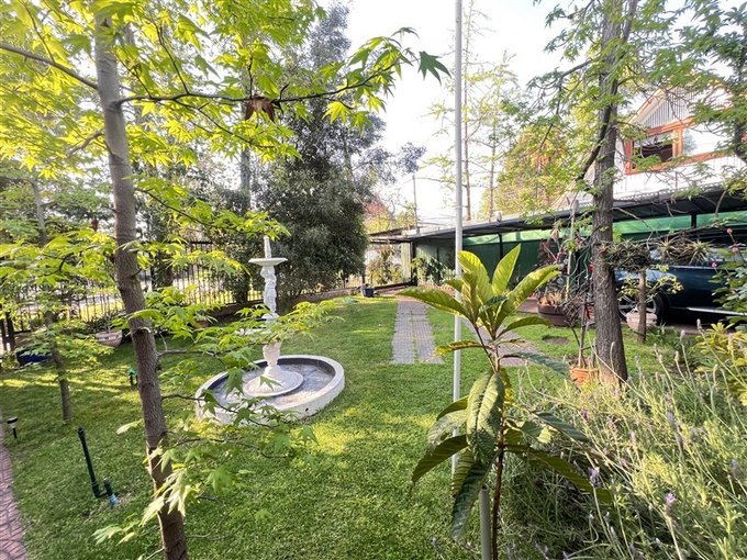 Lindo y gran antejardin con terraza con pergola de madera y fuente de agua.