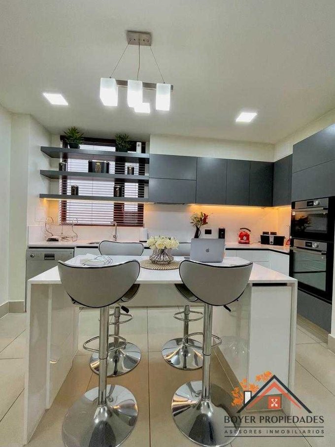 -Amplia cocina con mesón isla equipada con encimera, horno, campana.