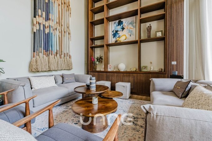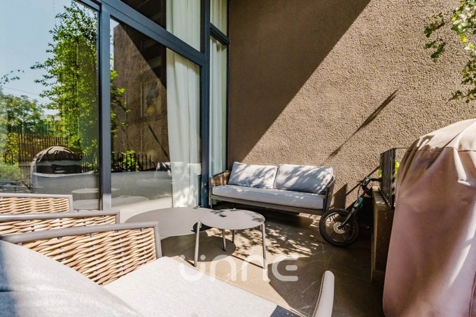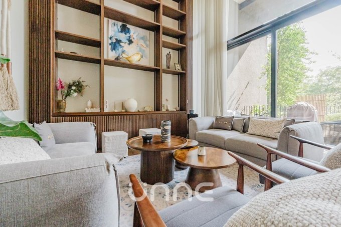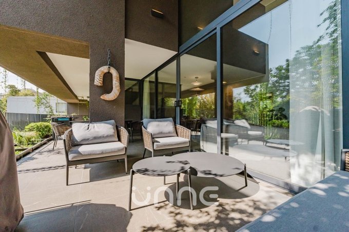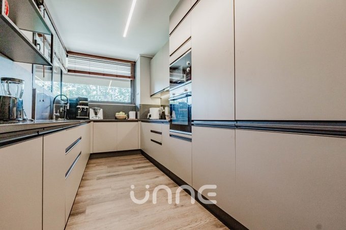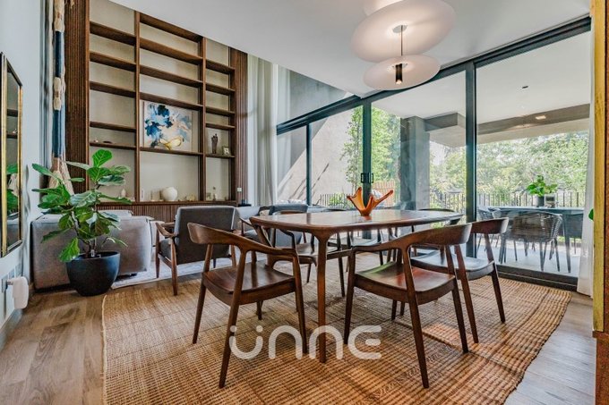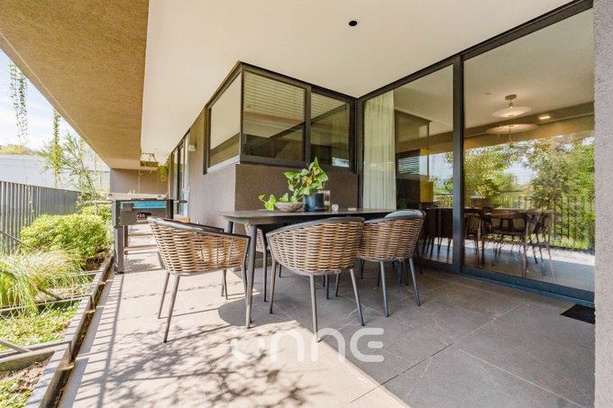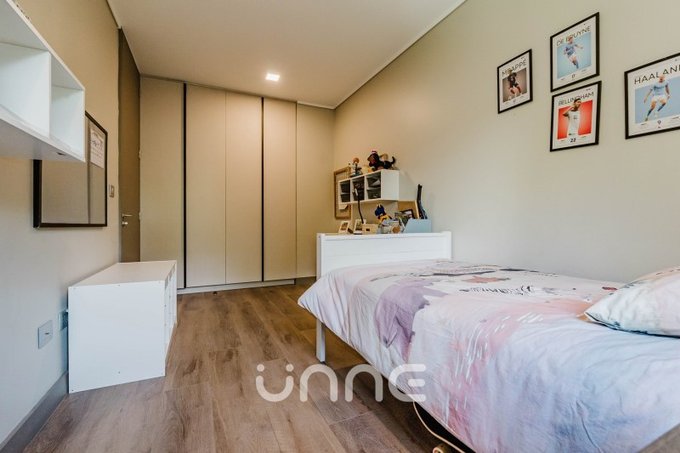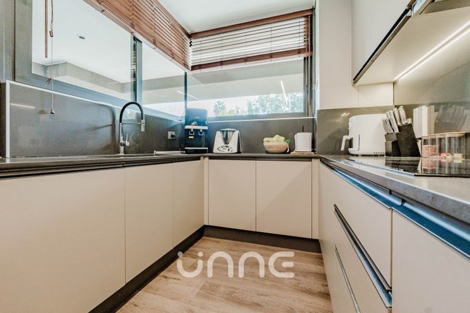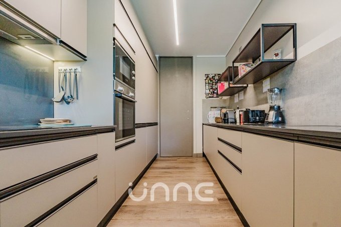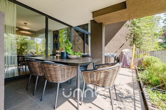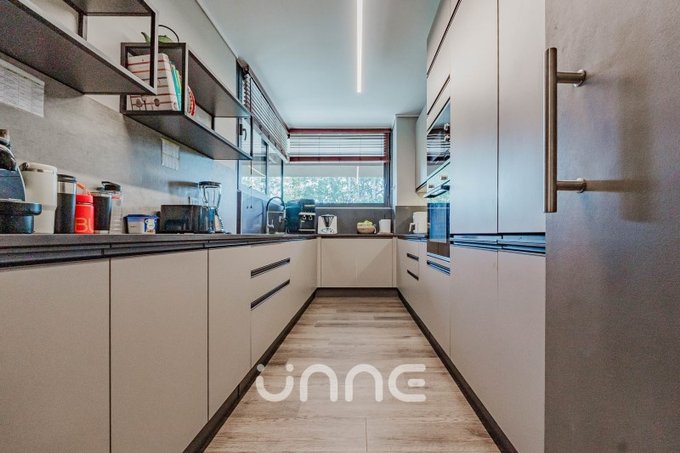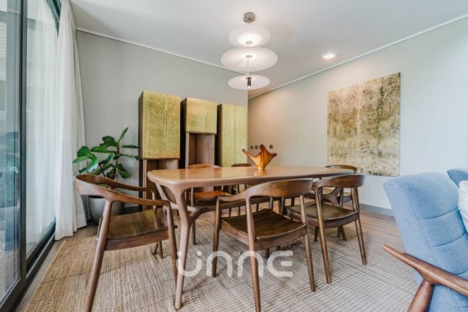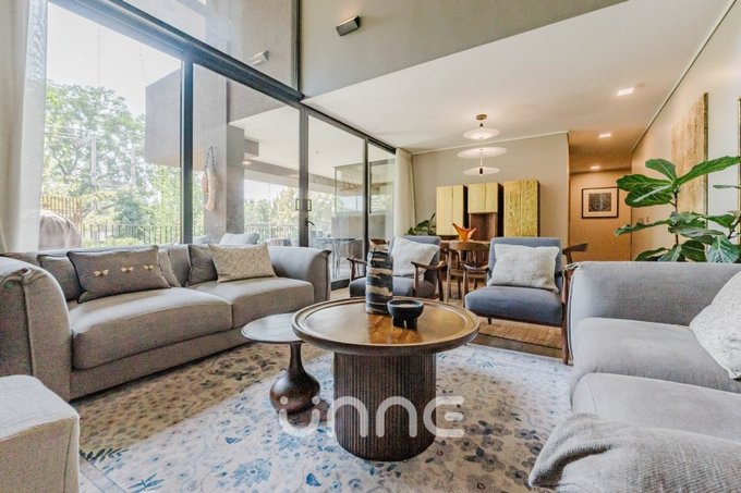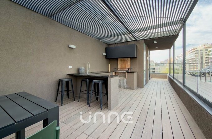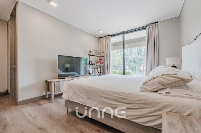 El departamento cuenta con un living-comedor de amplios ventanales con orientación norte, permitiendo la entrada de luz natural y vistas hacia áreas verdes y la ciudad. La cocina está completamente equipada con electrodomésticos de alta gama, horno empotrado, campana de acero inoxidable y refrigerador Bosch, además de mobiliario moderno y gran capacidad de almacenamiento.