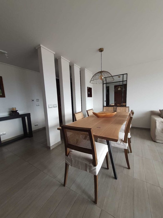 Hall de acceso con baño de visitas, living comedor con salida a amplia terraza con vista despejada, cocina semi integrada con isla y puerta corredera, logia con ventilación natural. Dormitorio principal en suite con salida a terraza, dos dormitorios secundarios que comparten baño.