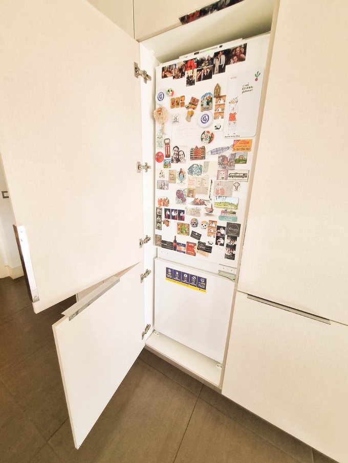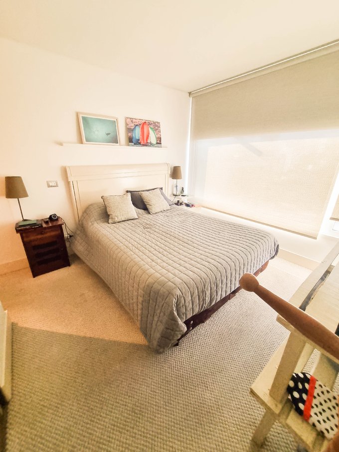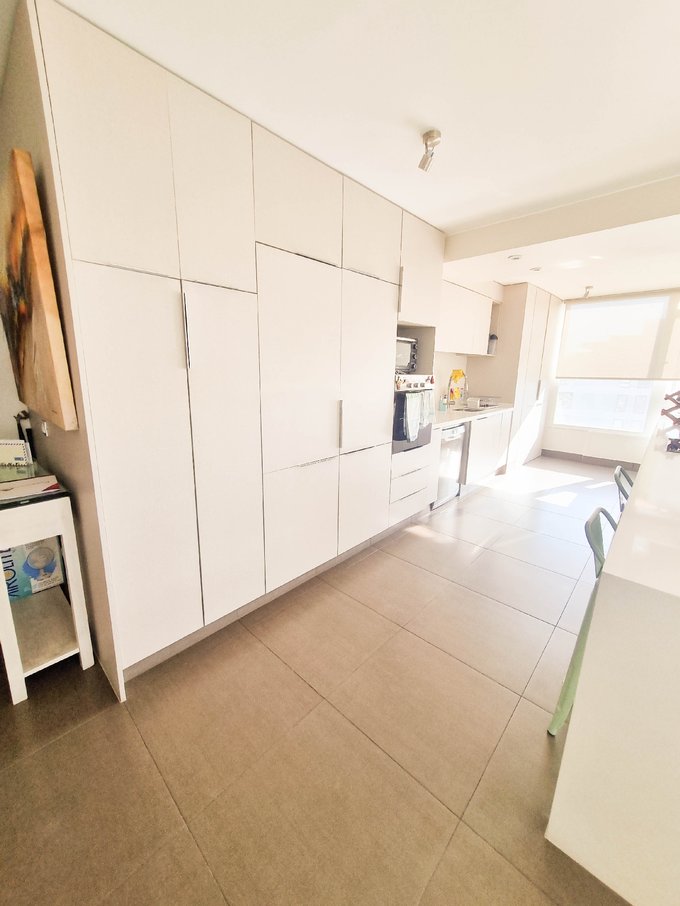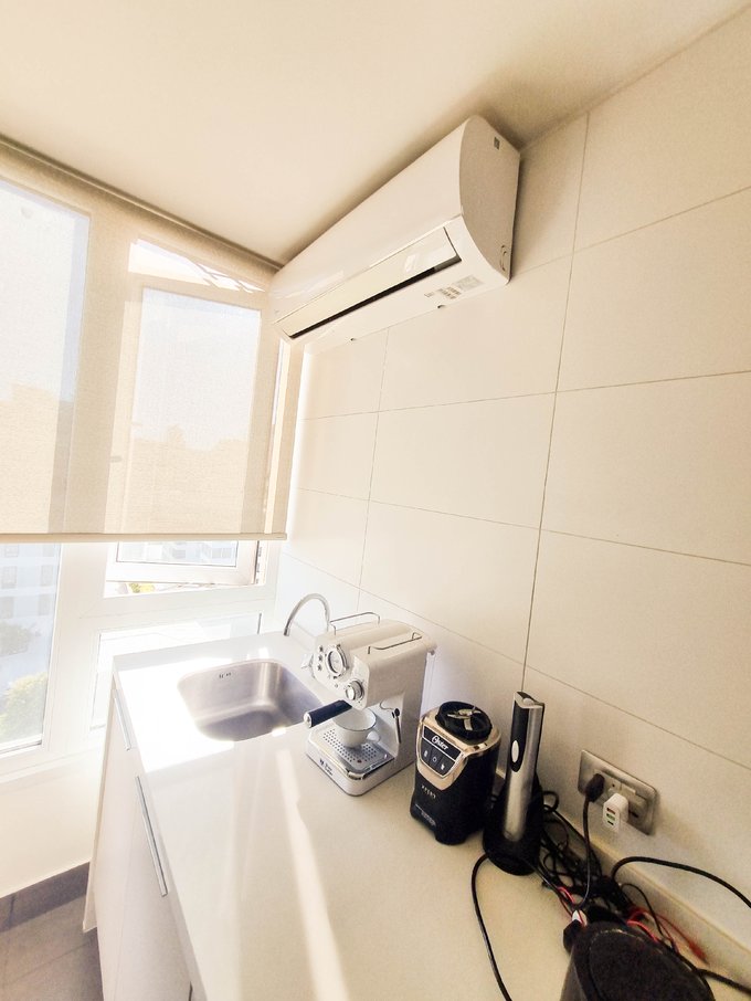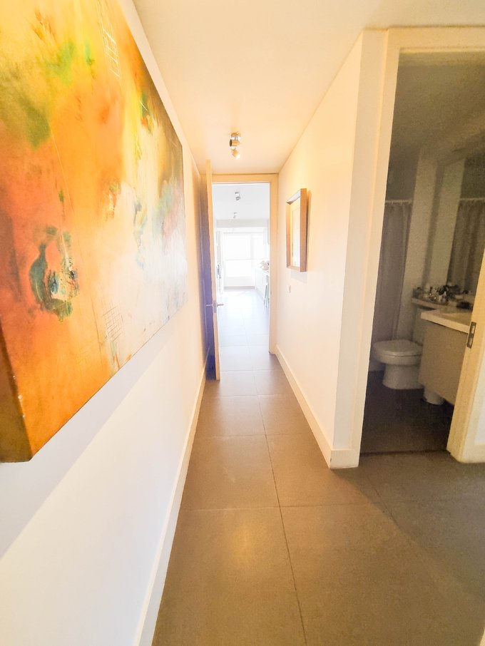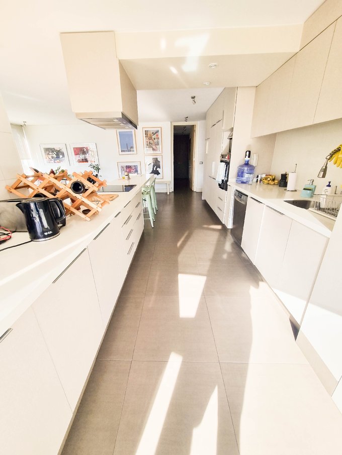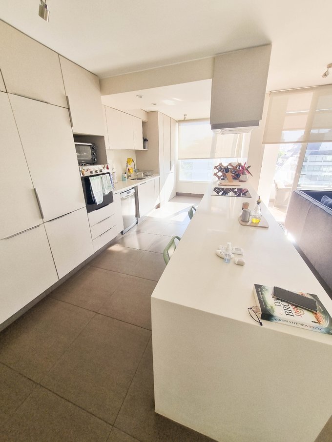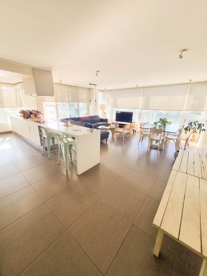 El interior presenta un living comedor conectado a una amplia cocina americana completamente equipada con encimera, horno, campana y refrigerador integrado oculto. Conexión para lavadora.
